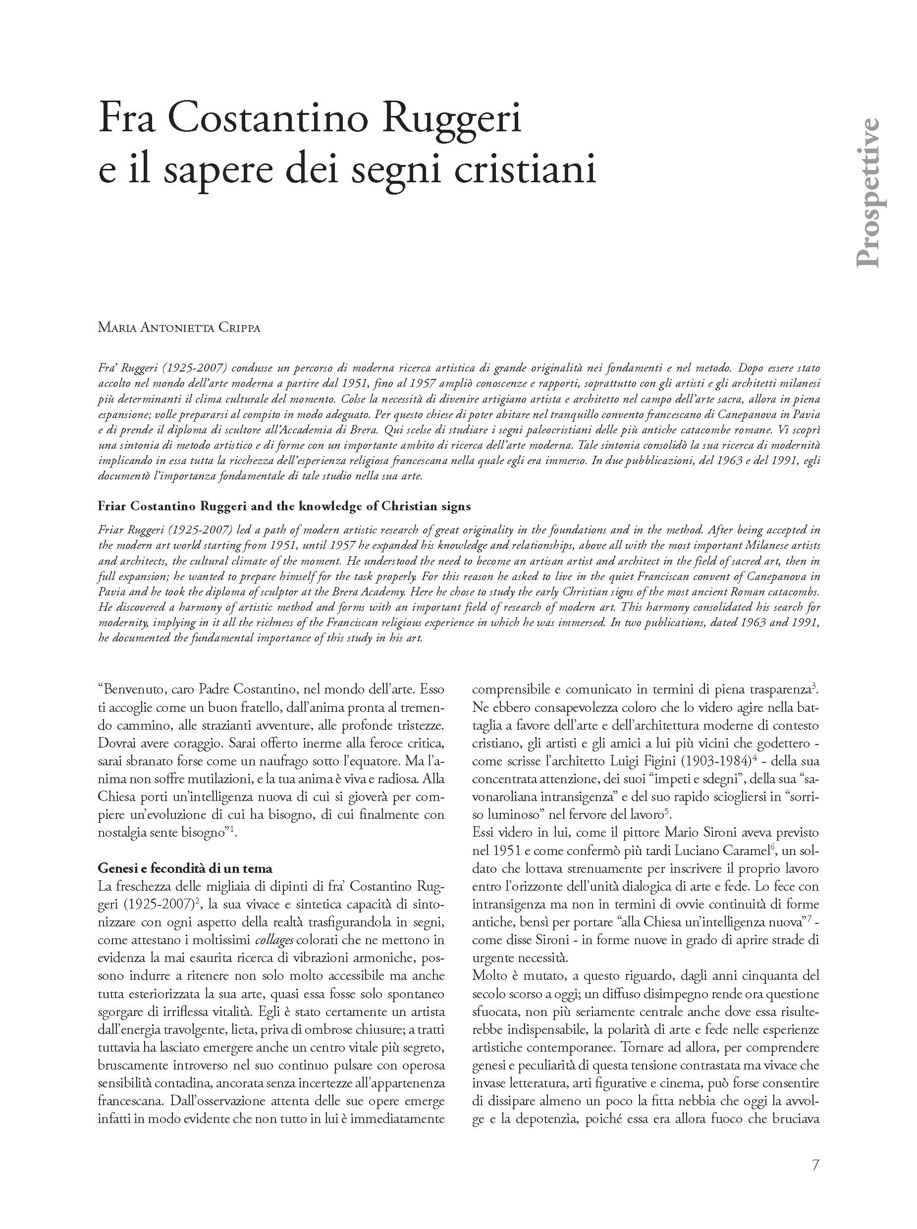 Fra’ Ruggeri (1925-2007) condusse un percorso di moderna ricerca artistica di grande originalità nei fondamenti e nel metodo. Dopo essere stato accolto nel mondo dell’arte moderna a partire dal 1951, fino al 1957 ampliò conoscenze e rapporti, soprattutto con gli artisti e gli architetti milanesi più determinanti il clima culturale del momento. Colse la necessità di divenire artigiano artista e architetto nel campo dell’arte sacra, allora in piena espansione; volle prepararsi al compito in modo adeguato. Per questo chiese di poter abitare nel tranquillo convento francescano di Canepanova in Pavia e di prende il diploma di scultore all’Accademia di Brera. Qui scelse di studiare i segni paleocristiani delle più antiche catacombe romane. Vi scoprì una sintonia di metodo artistico e di forme con un importante ambito di ricerca dell’arte moderna. Tale sintonia consolidò la sua ricerca di modernità implicando in essa tutta la ricchezza dell’esperienza religiosa francescana nella quale egli era immerso. In due pubblicazioni, del 1963 e del 1991, egli documentò l’importanza fondamentale di tale studio nella sua arte.