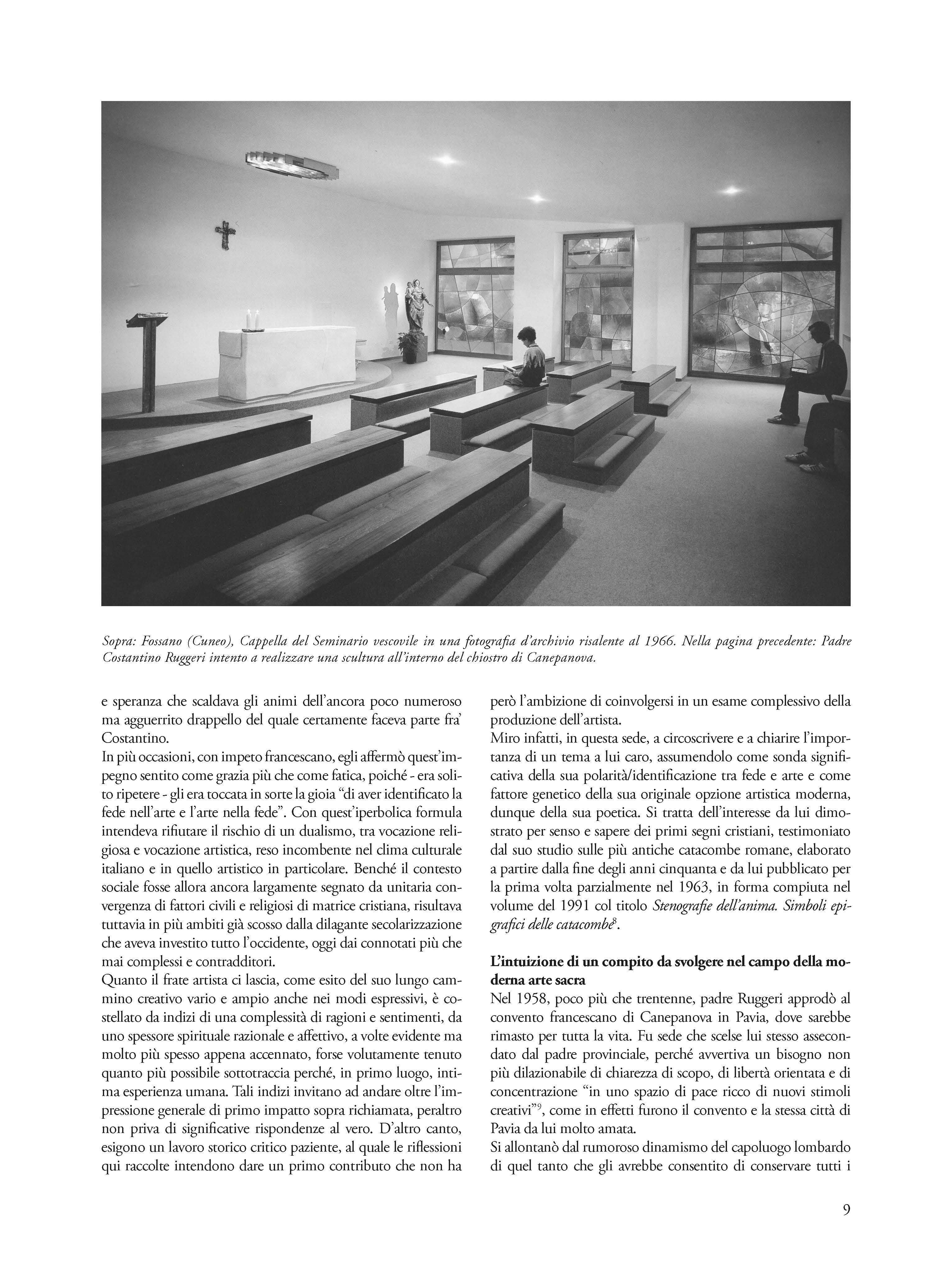 Friar Ruggeri (1925-2007) led a path of modern artistic research of great originality in the foundations and in the method. After being accepted in the modern art world starting from 1951, until 1957 he expanded his knowledge and relationships, above all with the most important Milanese artists and architects, the cultural climate of the moment. He understood the need to become an artisan artist and architect in the field of sacred art, then in full expansion; he wanted to prepare himself for the task properly. For this reason he asked to live in the quiet Franciscan convent of Canepanova in Pavia and he took the diploma of sculptor at the Brera Academy. Here he chose to study the early Christian signs of the most ancient Roman catacombs. He discovered a harmony of artistic method and forms with an important field of research of modern art. This harmony consolidated his search for modernity, implying in it all the richness of the Franciscan religious experience in which he was immersed. In two publications, dated 1963 and 1991, he documented the fundamental importance of this study in his art.