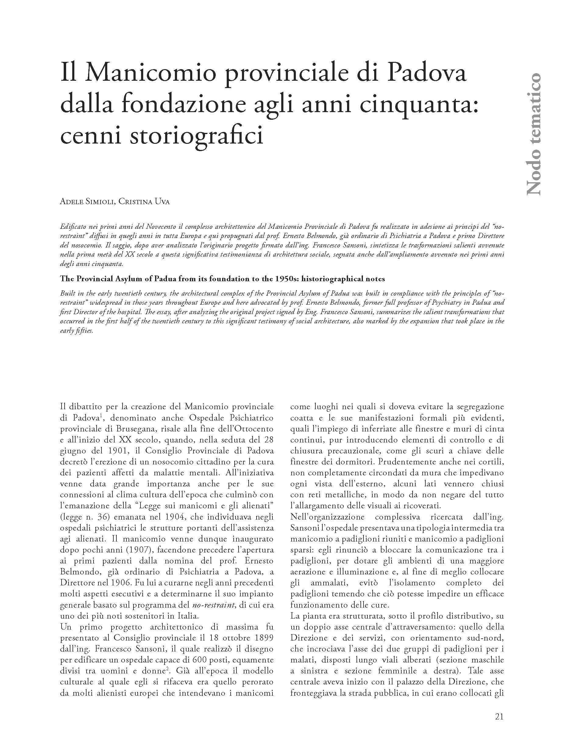 Edificato nei primi anni del Novecento il complesso architettonico del Manicomio Provinciale di Padova fu realizzato in adesione ai principi del “no-restraint” diffusi in quegli anni in tutta Europa e qui propugnati dal prof. Ernesto Belmondo, già ordinario di Psichiatria a Padova e primo Direttore del nosocomio. Il saggio, dopo aver analizzato l’originario progetto firmato dall’ing. Francesco Sansoni, sintetizza le trasformazioni salienti avvenute nella prima metà del XX secolo a questa significativa testimonianza di architettura sociale, segnata anche dall’ampliamento avvenuto nei primi anni degli anni cinquanta.