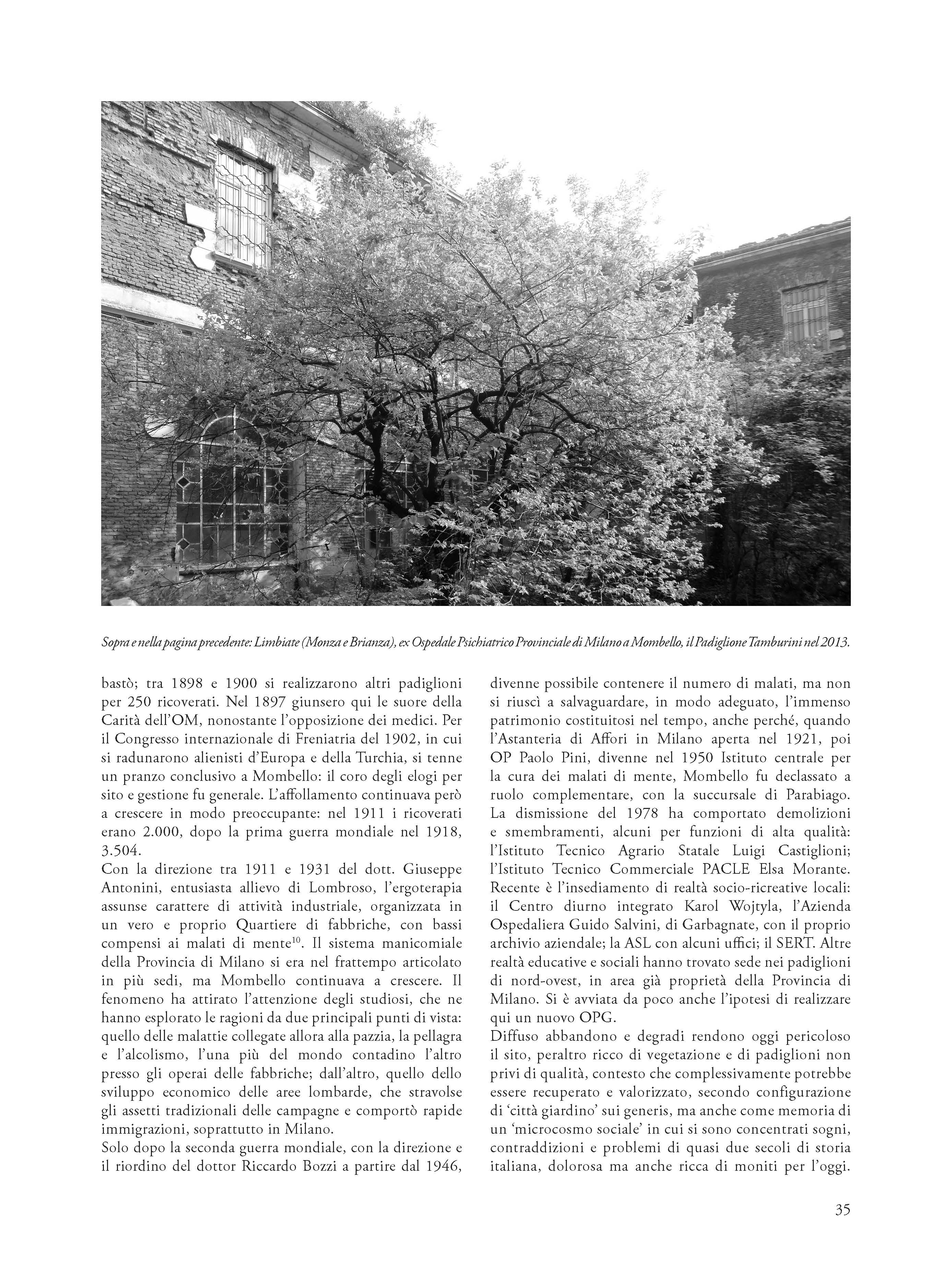 The squalor of the old hospitale for madmen, of S. Vincenzo in Milan, prompted the Austrian government to move them in 1781 to the Senavra palace, where the Milanese alienists made a feeble attempt at asylum reform. A larger complex became urgent and its project in Desio remained unsuccessful, it was opened in Mombello in 1867, in the eighteenth-century Villa Crivelli Pusterla, around which it grew continuously to accommodate more than 3000 patients. Part of a multi-pole provincial psychiatric system, after decommissioning it was partly destined for relevant functions and largely abandoned. Instead, it deserves to be recovered and enhanced as a ‘garden city’ and as a memory of a microcosm of Italian history, painful but also full of warnings for today.