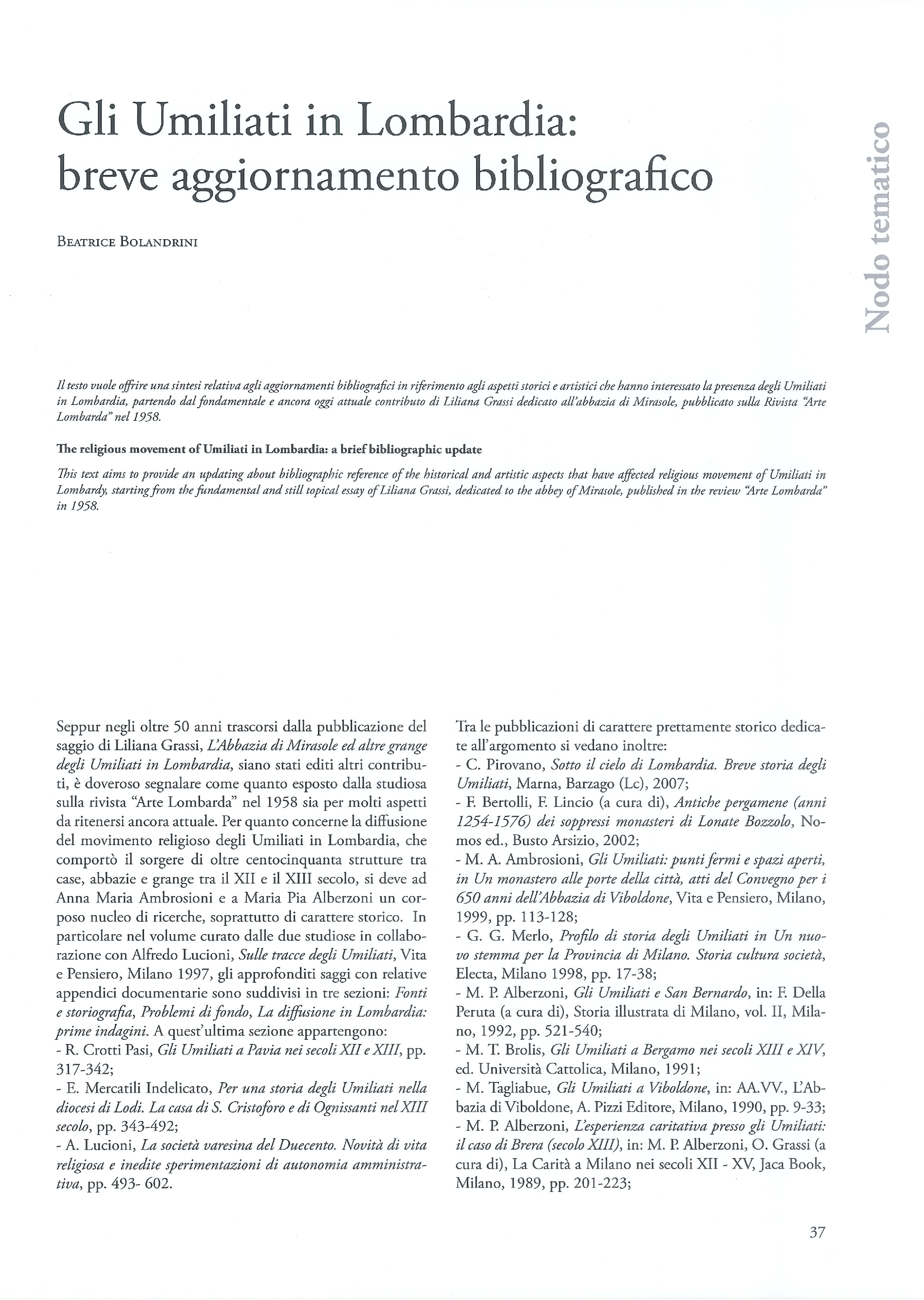 Il testo si prefigge di offrire una sintesi relativa agli aggiornamenti bibliografici in riferimento agli aspetti storici e artistici che hanno interessato la presenza degli Umiliati in Lombardia, partendo dal fondamentale e ancora oggi attuale contributo di Liliana Grassi dedicato all’abbazia di Mirasole, pubblicato sulla Rivista “Arte Lombarda” nel 1958.