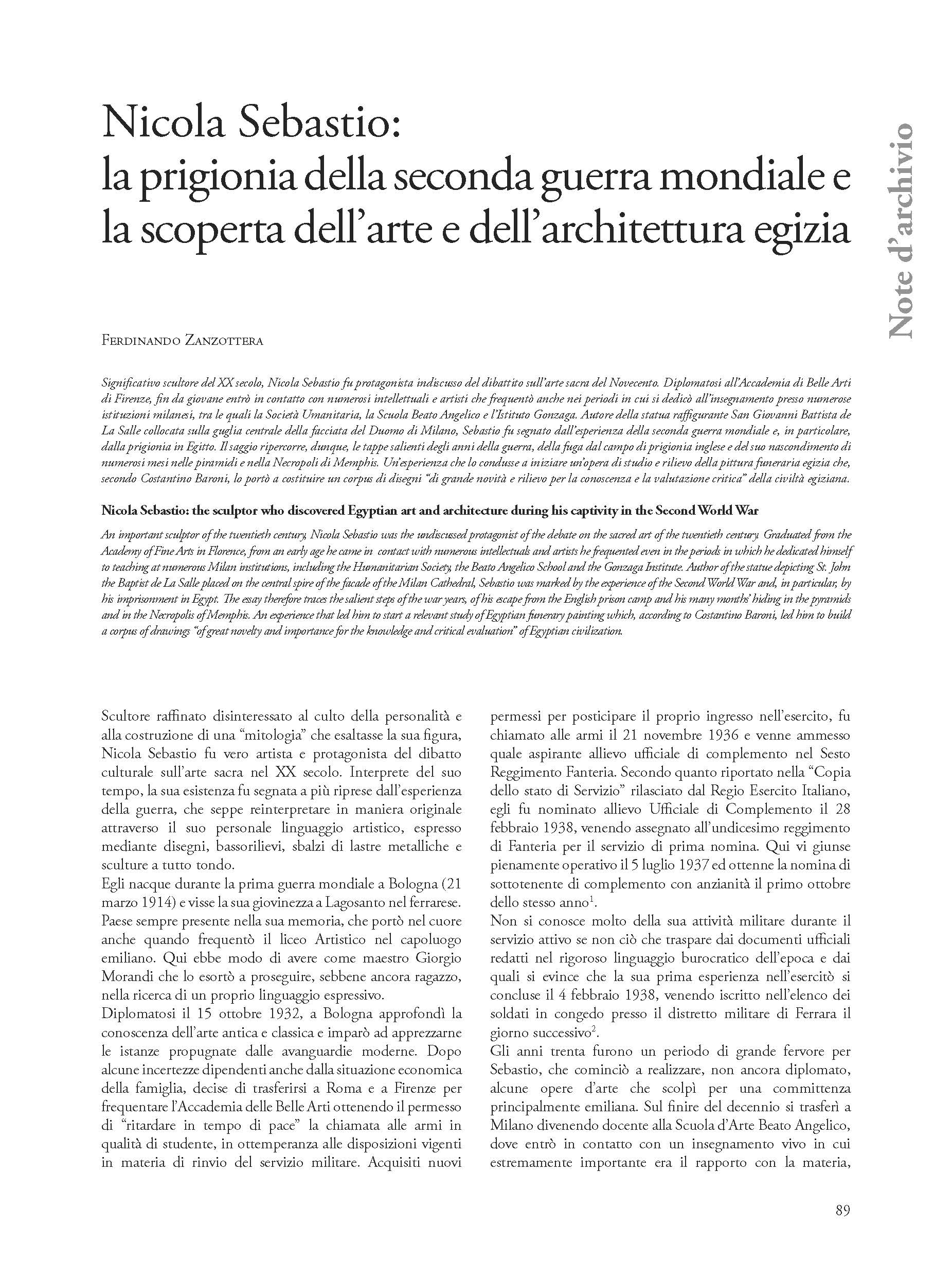 Significativo scultore del XX secolo, Nicola Sebastio fu protagonista indiscusso del dibattito sull’arte sacra del Novecento. Diplomatosi all’Accademia di Belle Arti di Firenze, fin da giovane entrò in contatto con numerosi intellettuali e artisti che frequentò anche nei periodi in cui si dedicò all’insegnamento presso numerose istituzioni milanesi, tra le quali la Società Umanitaria, la Scuola Beato Angelico e l’Istituto Gonzaga. Autore della statua raffigurante San Giovanni Battista de La Salle collocata sulla guglia centrale della facciata del Duomo di Milano, Sebastio fu segnato dall’esperienza della seconda guerra mondiale e, in particolare, dalla prigionia in Egitto. Il saggio ripercorre, dunque, le tappe salienti degli anni della guerra, della fuga dal campo di prigionia inglese e del suo nascondimento di numerosi mesi nelle piramidi e nella Necropoli di Memphis. Un’esperienza che lo condusse a iniziare un’opera di studio e rilievo della pittura funeraria egizia che, secondo Costantino Baroni, lo portò a costituire un corpus di disegni “di grande novità e rilievo per la conoscenza e la valutazione critica” della civiltà egiziana.