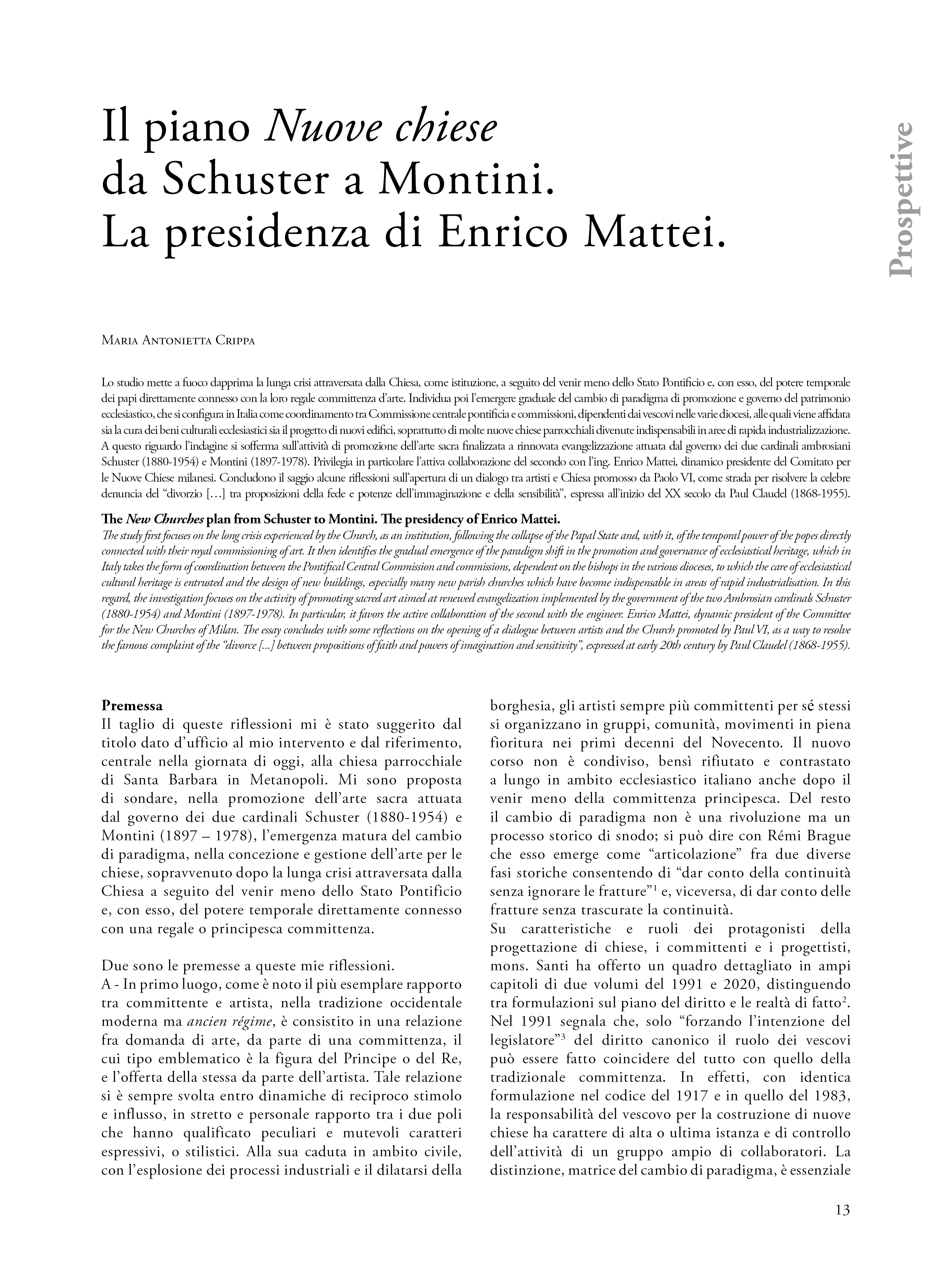 The study first focuses on the long crisis experienced by the Church, as an institution, following the collapse of the Papal State and, with it, of the temporal power of the popes directly connected with their royal commissioning of art. It then identifies the gradual emergence of the paradigm shift in the promotion and governance of ecclesiastical heritage, which in Italy takes the form of coordination between the Pontifical Central Commission and commissions, dependent on the bishops in the various dioceses, to which the care of ecclesiastical cultural heritage is entrusted and the design of new buildings, especially many new parish churches which have become indispensable in areas of rapid industrialisation. In this regard, the investigation focuses on the activity of promoting sacred art aimed at renewed evangelization implemented by the government of the two Ambrosian cardinals Schuster (1880-1954) and Montini (1897-1978). In particular, it favors the active collaboration of the second with the engineer. Enrico Mattei, dynamic president of the Committee for the New Churches of Milan. The essay concludes with some reflections on the opening of a dialogue between artists and the Church promoted by Paul VI, as a way to resolve the famous complaint of the “divorce [...] between propositions of faith and powers of imagination and sensitivity”, expressed at early 20th century by Paul Claudel (1868-1955).