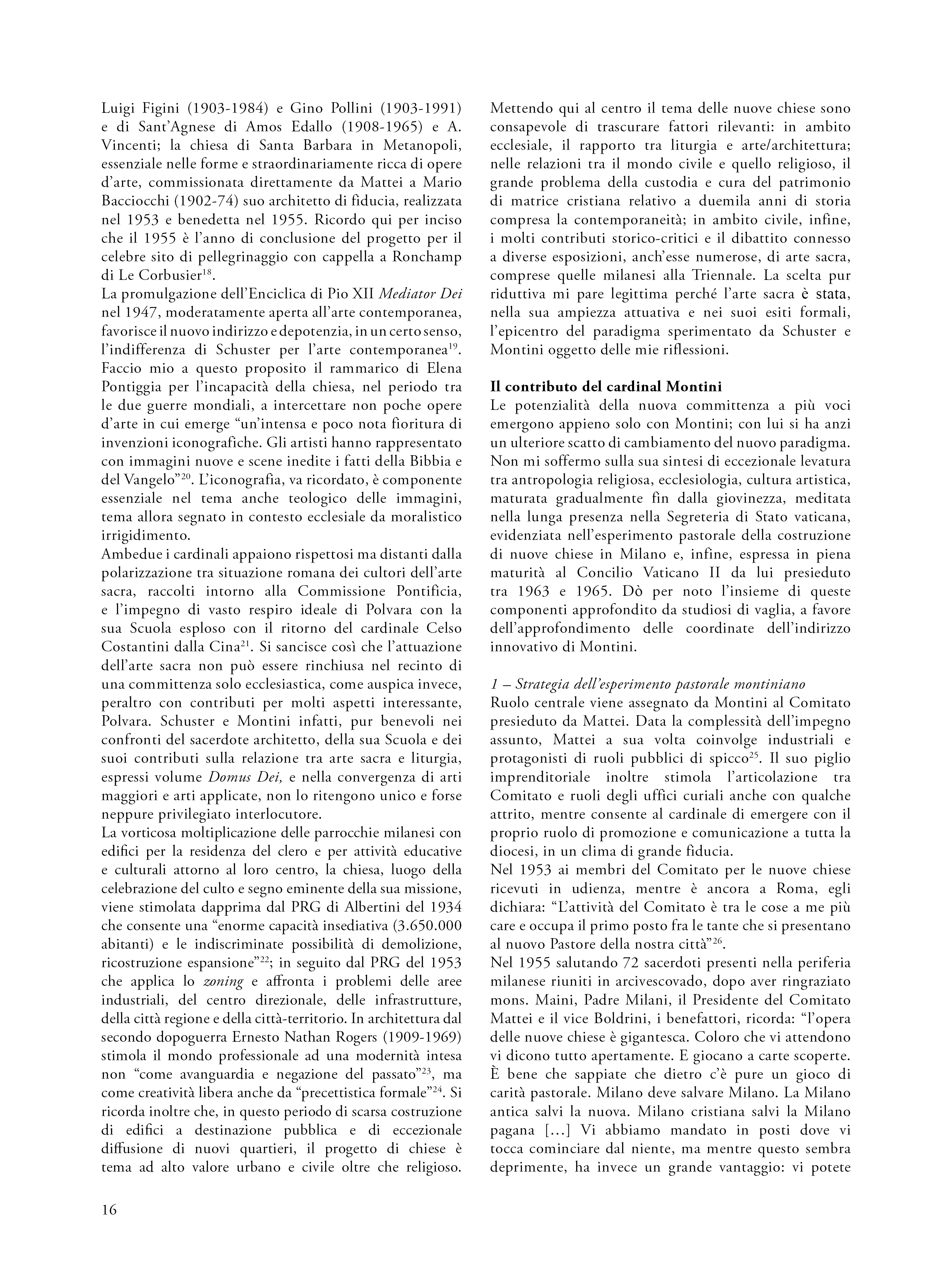 Lo studio mette a fuoco dapprima la lunga crisi attraversata dalla Chiesa, come istituzione, a seguito del venir meno dello Stato Pontificio e, con esso, del potere temporale dei papi direttamente connesso con la loro regale committenza d’arte. Individua poi l’emergere graduale del cambio di paradigma di promozione e governo del patrimonio ecclesiastico, che si configura in Italia come coordinamento tra Commissione centrale pontificia e commissioni, dipendenti dai vescovi nelle varie diocesi, alle quali viene affidata sia la cura dei beni culturali ecclesiastici sia il progetto di nuovi edifici, soprattutto di molte nuove chiese parrocchiali divenute indispensabili in aree di rapida industrializzazione. A questo riguardo l’indagine si sofferma sull’attività di promozione dell’arte sacra finalizzata a rinnovata evangelizzazione attuata dal governo dei due cardinali ambrosiani Schuster (1880-1954) e Montini (1897-1978). Privilegia in particolare l’attiva collaborazione del secondo con l’ing. Enrico Mattei, dinamico presidente del Comitato per le Nuove Chiese milanesi. Concludono il saggio alcune riflessioni sull’apertura di un dialogo tra artisti e Chiesa promosso da Paolo VI, come strada per risolvere la celebre denuncia del “divorzio […] tra proposizioni della fede e potenze dell’immaginazione e della sensibilità”, espressa all’inizio del XX secolo da Paul Claudel (1868-1955).