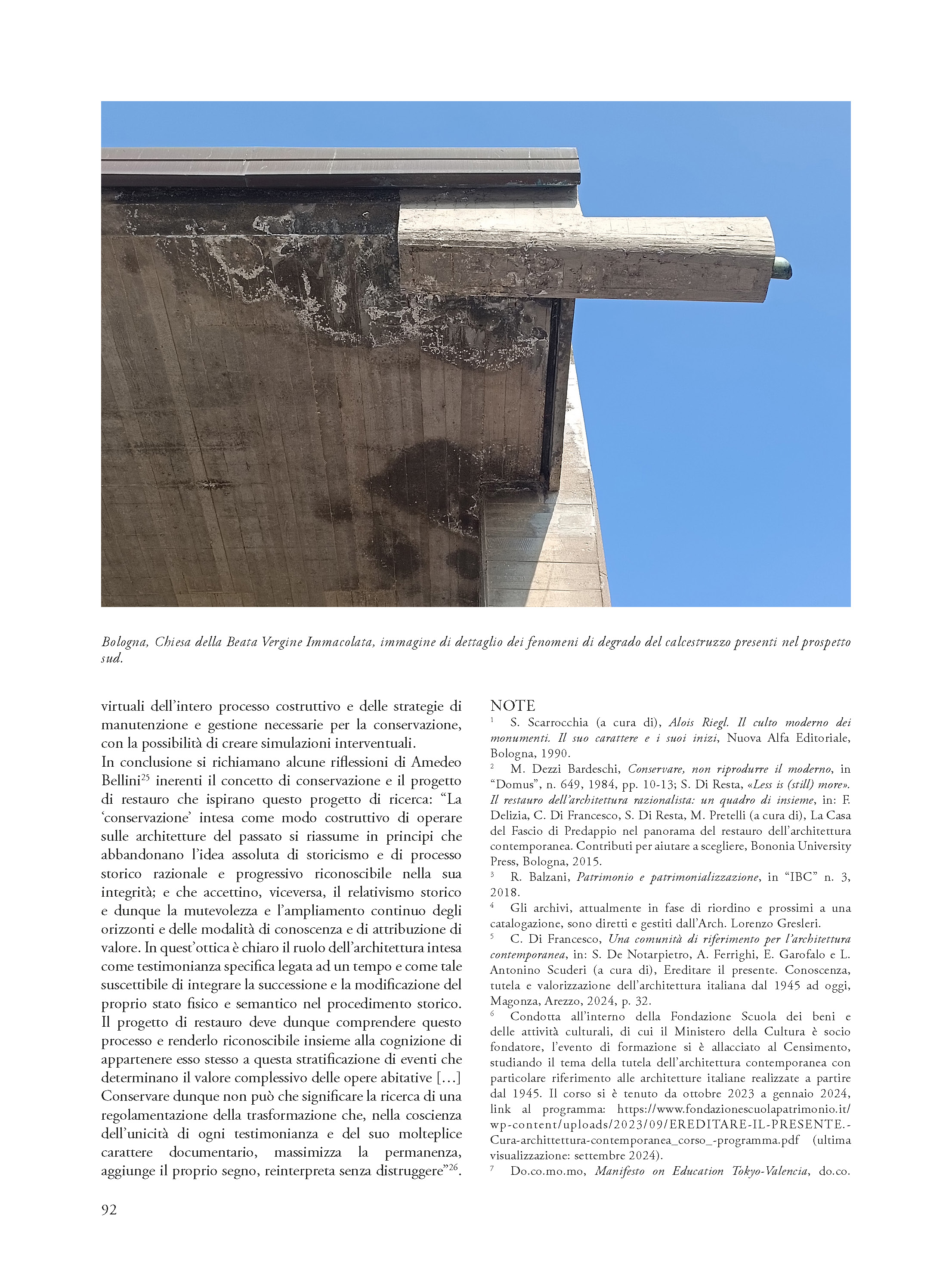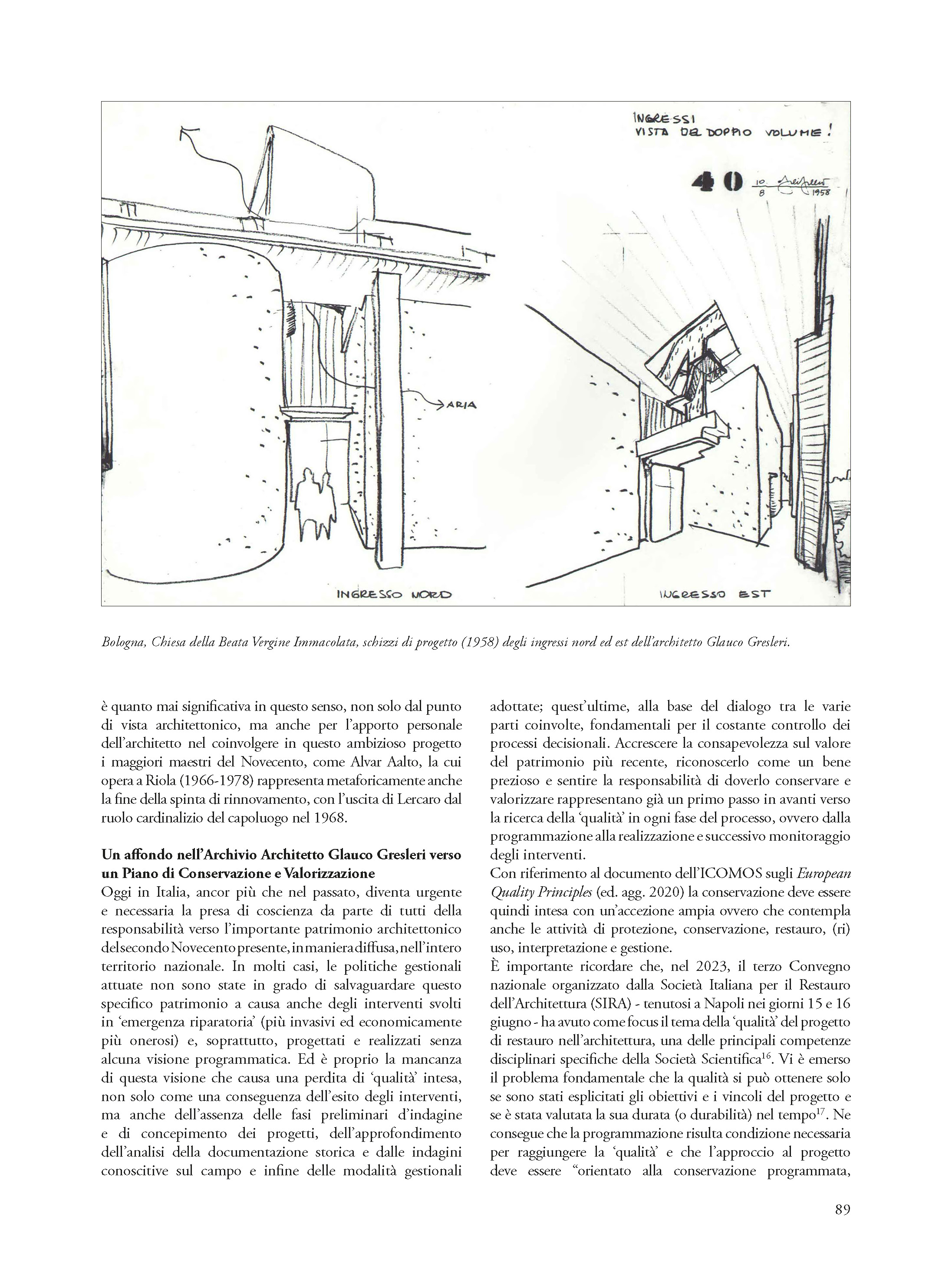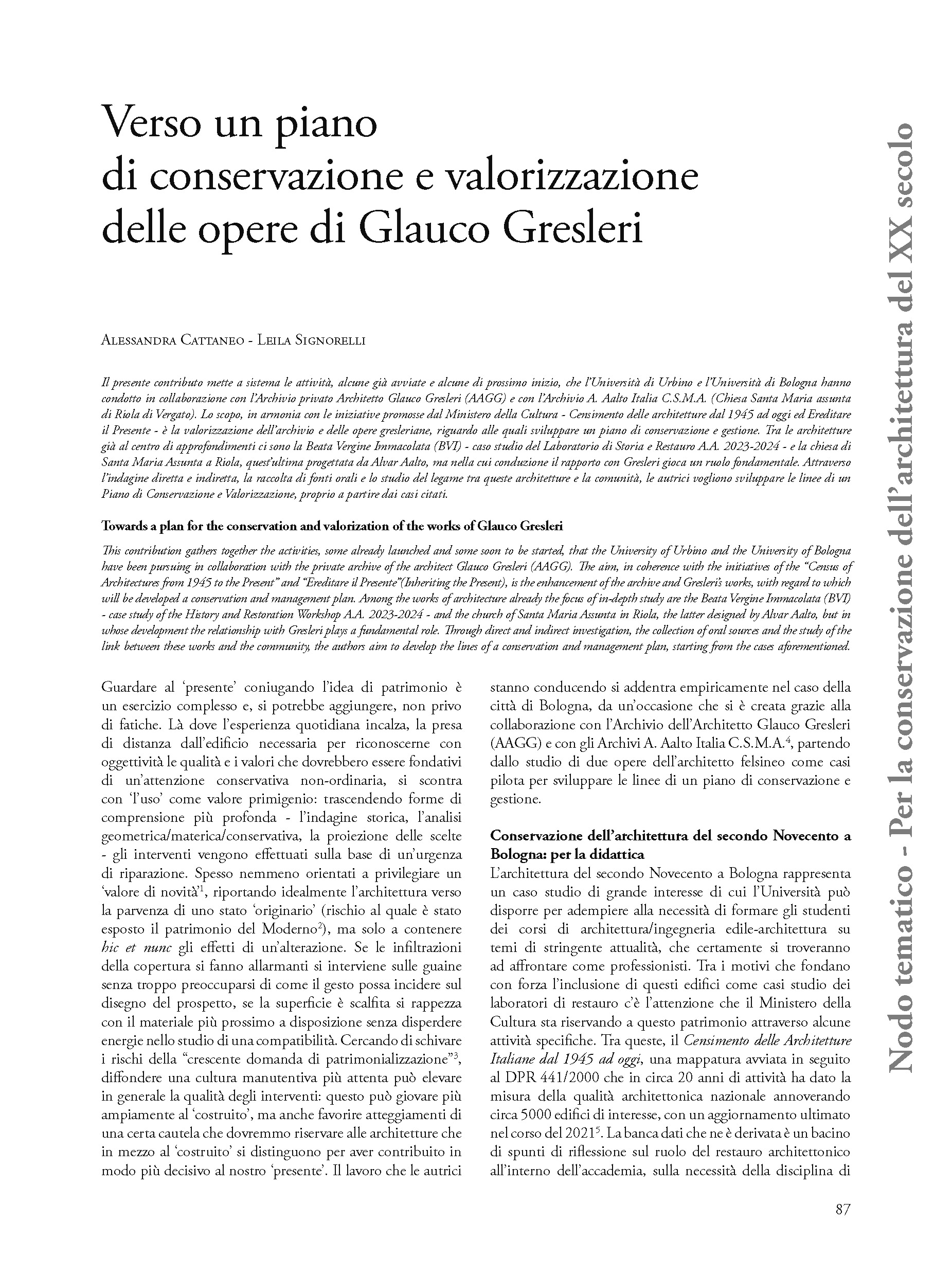 This contribution gathers together the activities, some already launched and some soon to be started, that the University of Urbino and the University of Bologna have been pursuing in collaboration with the private archive of the architect Glauco Gresleri (AAGG). The aim, in coherence with the initiatives of the “Census of Architectures from 1945 to the Present” and “Ereditare il Presente”(Inheriting the Present), is the enhancement of the archive and Gresleri’s works, with regard to which will be developed a conservation and management plan. Among the works of architecture already the focus of in-depth study are the Beata Vergine Immacolata (BVI) - case study of the History and Restoration Workshop A.A. 2023-2024 - and the church of Santa Maria Assunta in Riola, the latter designed by Alvar Aalto, but in whose development the relationship with Gresleri plays a fundamental role. Through direct and indirect investigation, the collection of oral sources and the study of the link between these works and the community, the authors aim to develop the lines of a conservation and management plan, starting from the cases aforementioned.