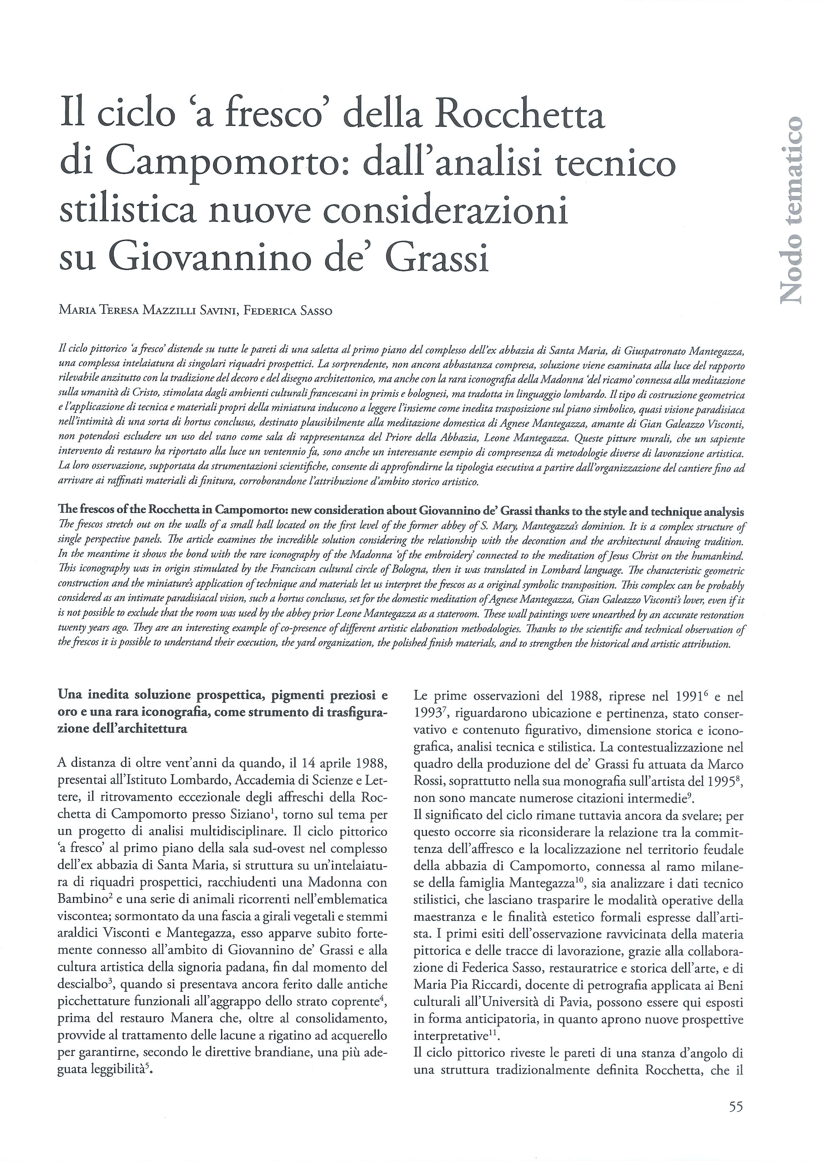 The frescos stretch out on the walls of a small hall located on the first level of the former abbey of S. Mary, Mantegazza’s dominion. It is a complex structure of single perspective panels. The article examines the incredible solution considering the relationship with the decoration and the architectural drawing tradition. In the meantime it shows the bond with the rare iconography of the Madonna ‘of the embroidery’ connected to the meditation of Jesus Christ on the humankind. This iconography was in origin stimulated by the Franciscan cultural circle of Bologna, then it was translated in Lombard language. The characteristic geometric construction and the miniature’s application of technique and materials let us interpret the frescos as a original symbolic transposition. This complex can be probably considered as an intimate paradisiacal vision, such a hortus conclusus, set for the domestic meditation of Agnese Mantegazza, Gian Galeazzo Visconti’s lover, even if it is not possible to exclude that the room was used by the abbey prior Leone Mantegazza as a stateroom. These wall paintings were unearthed by an accurate restoration twenty years ago. They are an interesting example of co-presence of different artistic elaboration methodologies. Thanks to the scientific and technical observation of the frescos it is possible to understand their execution, the yard organization, the polished finish materials, and to strengthen the historical and artistic attribution.