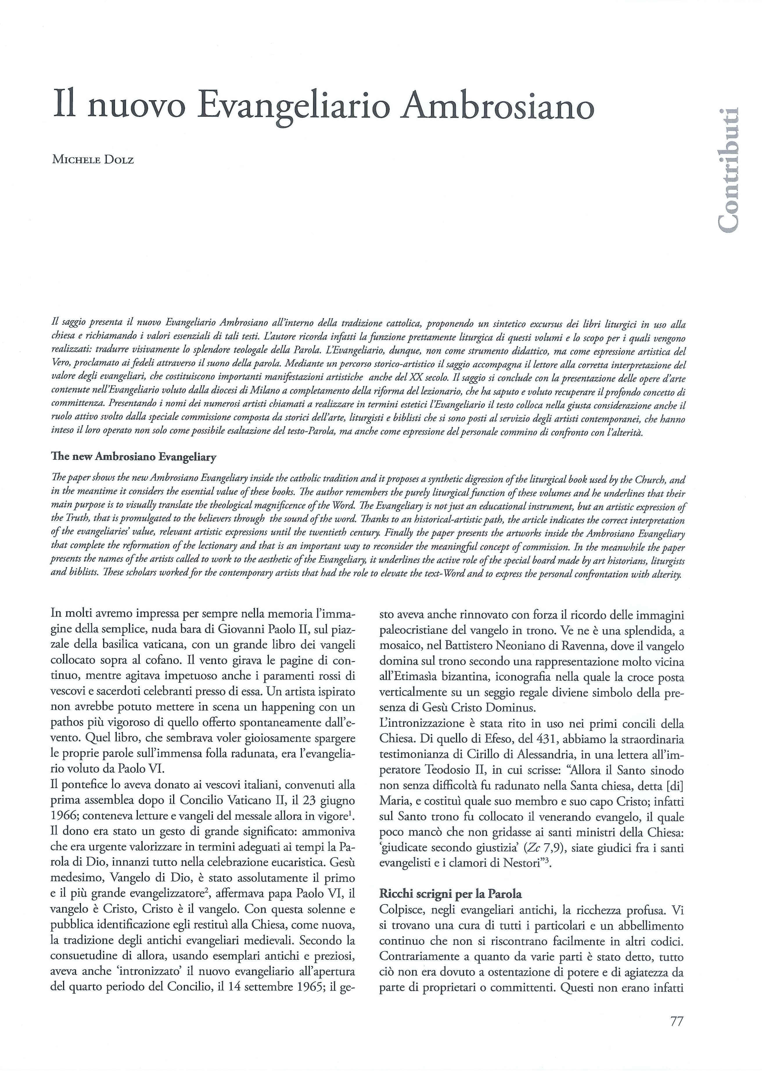 Il saggio presenta il nuovo Evangeliario Ambrosiano all’interno della tradizione cattolica, proponendo un sintetico excursus dei libri liturgici in uso alla chiesa e richiamando i valori essenziali di tali testi. L’autore ricorda infatti la funzione prettamente liturgica di questi volumi e lo scopo per i quali vengono realizzati: tradurre visivamente lo splendore teologale della Parola. L’Evangeliario, dunque, non come strumento didattico, ma come espressione artistica del Vero, proclamato ai fedeli attraverso il suono della parola. Mediante un percorso storico-artistico il saggio accompagna il lettore alla corretta interpretazione del valore degli evangeliari, che costituiscono importanti manifestazioni artistiche anche del XX secolo. Il saggio si conclude con la presentazione delle opere d’arte contenute nell’Evangeliario voluto dalla diocesi di Milano a completamento della riforma del lezionario, che ha saputo e voluto recuperare il profondo concetto di committenza. Presentando i nomi dei numerosi artisti chiamati a realizzare in termini estetici l’Evangeliario il testo colloca nella giusta considerazione anche il ruolo attivo svolto dalla speciale commissione composta da storici dell’arte, liturgisti e biblisti che si sono posti al servizio degli artisti contemporanei, che hanno inteso il loro operato non solo come possibile esaltazione del testo-Parola, ma anche come espressione del personale commino di confronto con l’alterità.