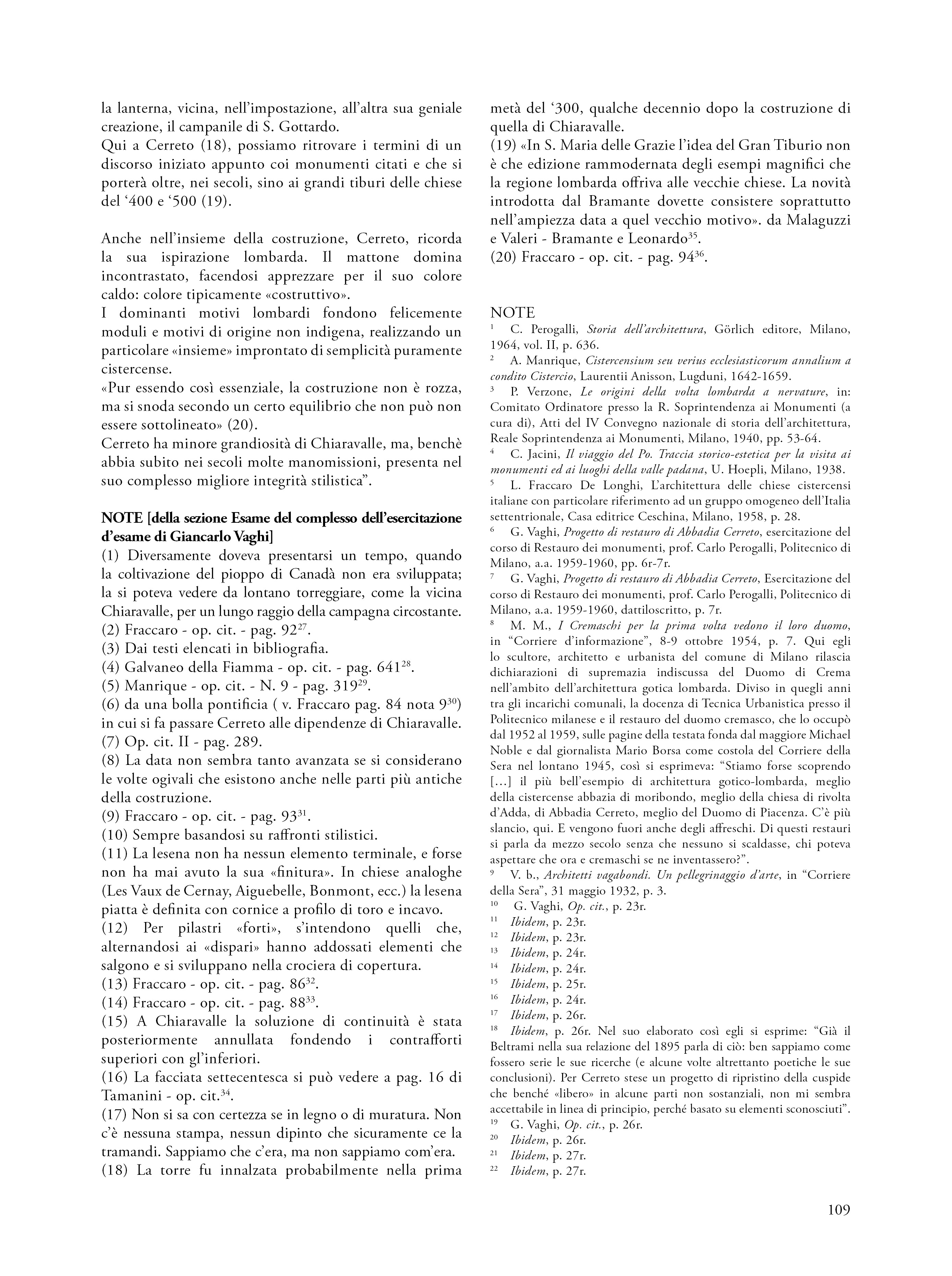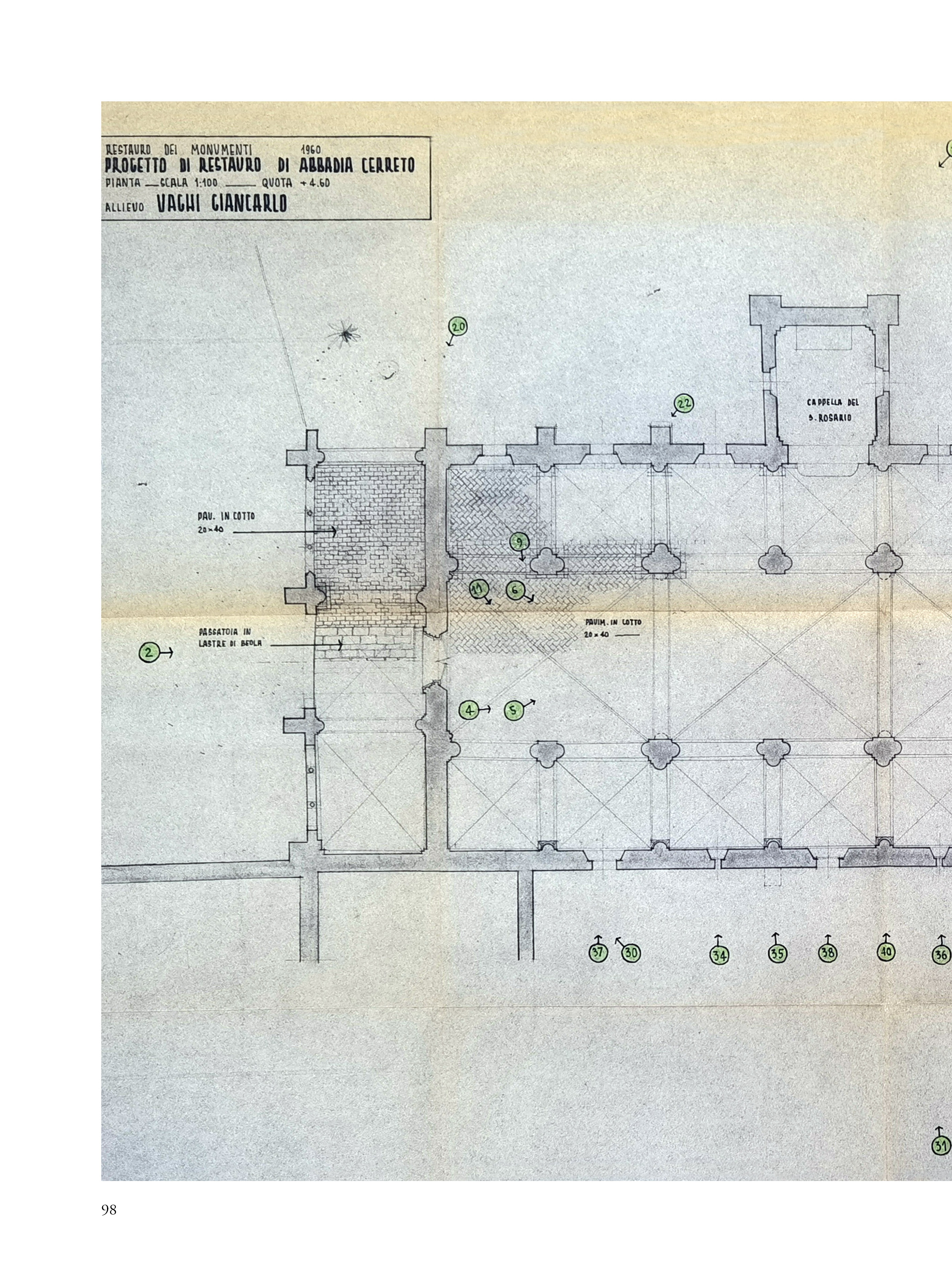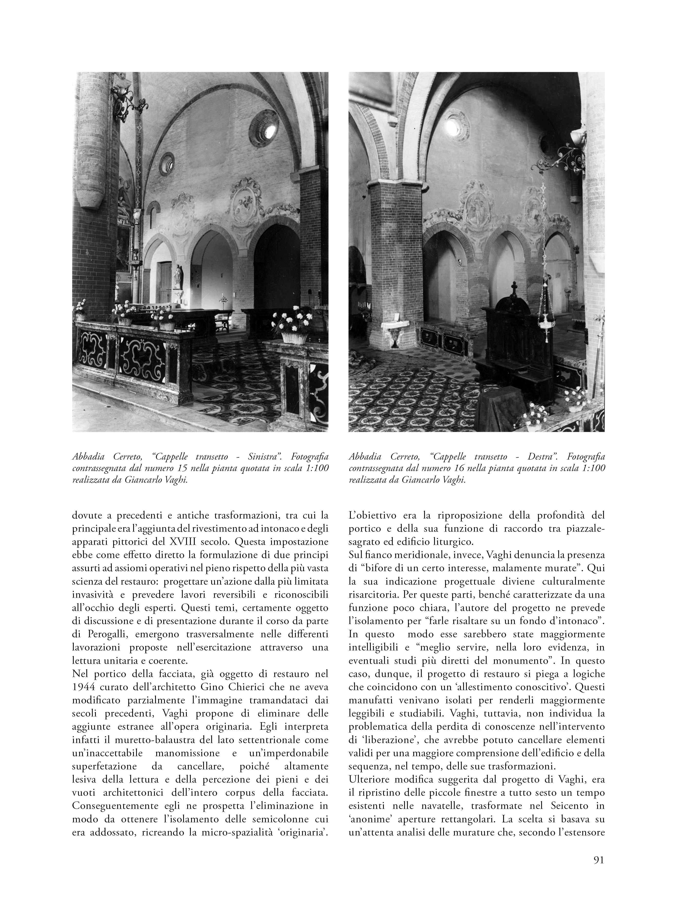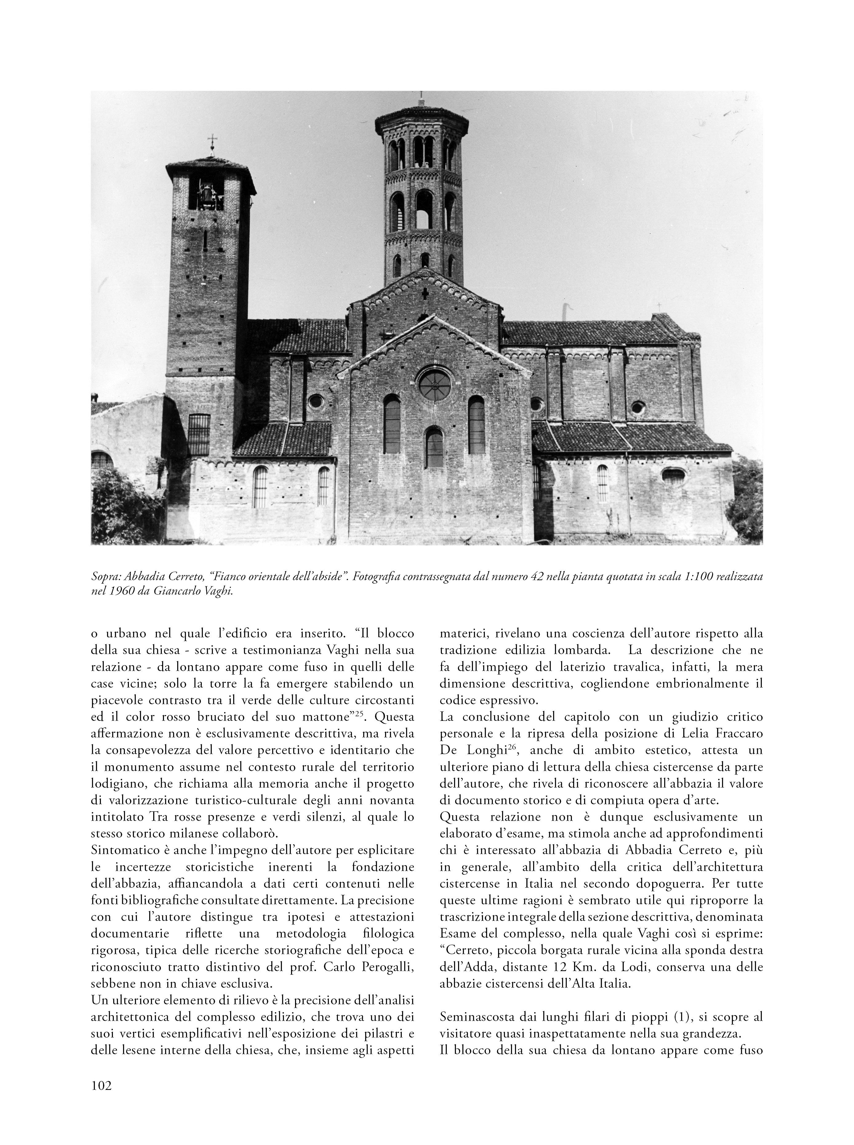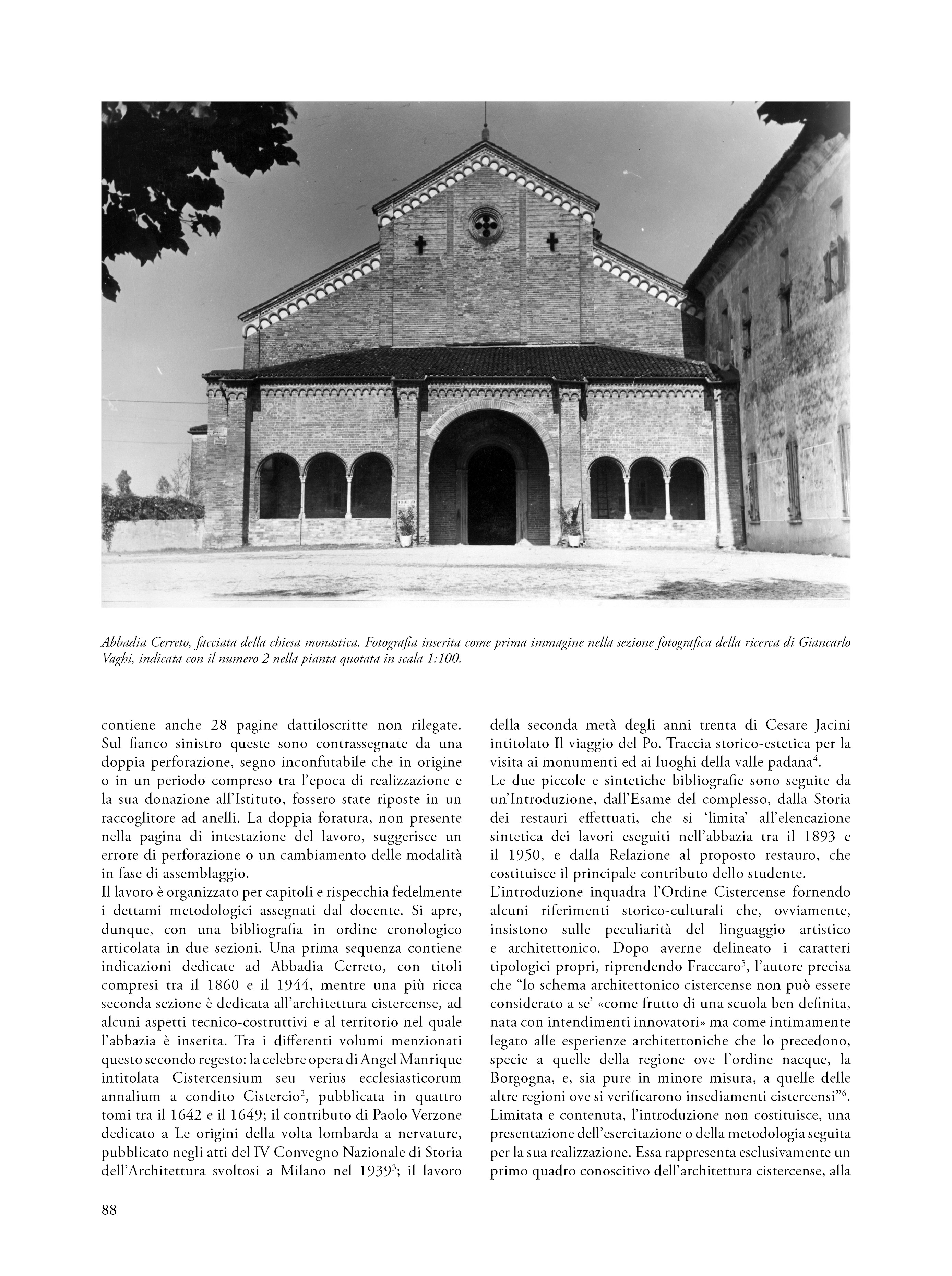 Il saggio propone una riflessione su un’esercitazione svoltasi nel 1960 nell’ambito del corso di Restauro tenuto al Politecnico di Milano dal prof. Carlo Perogalli. Il testo analizza l’elaborato che propone un intervento di restauro critico e conservativo sull’abbazia cistercense di Abbadia Cerreto (Lodi), fondato sulla conoscenza storica e sulla lettura architettonica del complesso come appariva sessantacinque anni fa. L’autore del progetto rifiuta le ricostruzioni arbitrarie e privilegia interventi reversibili e riconoscibili, in linea con il dibattito interno al polo universitario milanese e in adesione alla Carta di Atene (1933), anticipando parzialmente i contenuti della Carta di Venezia del 1964. L’abbazia è descritta come esempio significativo di architettura cistercense lombarda, con particolare attenzione alla verticalità, all’uso del mattone e alla torre nolare ottagonale, in parziale adesione al metodo narrativo proposta dal docente e storico milanese. Il progetto evidenzia una sensibilità storicista e una precoce coscienza critica del patrimonio, rendendo l’esercitazione non solo un’interessante testimonianza dello stato conservativo del complesso architettonico lodigiano, ma anche una testimonianza metodologica dell’insegnamento del restauro negli anni sessanta.