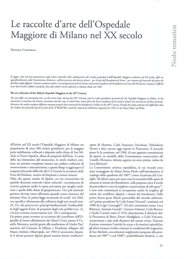 The text offers an interesting view on the artists that, during the 20th Century, used to make gratulatori portraits for the Ospedale Maggiore in Milan. In the meantime it examines the artistic committee and the way in which these artists from the Brera Academy of Art used to obtain the commission of these portraits. Moreover the author analyzes different museum projects that concerned the Benefactors’ Gallery in the 20th Century. Finally the study evaluates the difficulties that the Gallery has faced during the period of the II World War, until the important exhibition organized in 1981 in the Royal Palace of Milan.