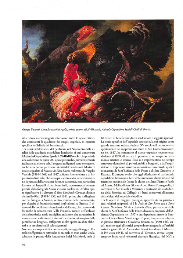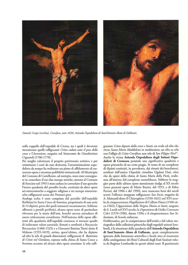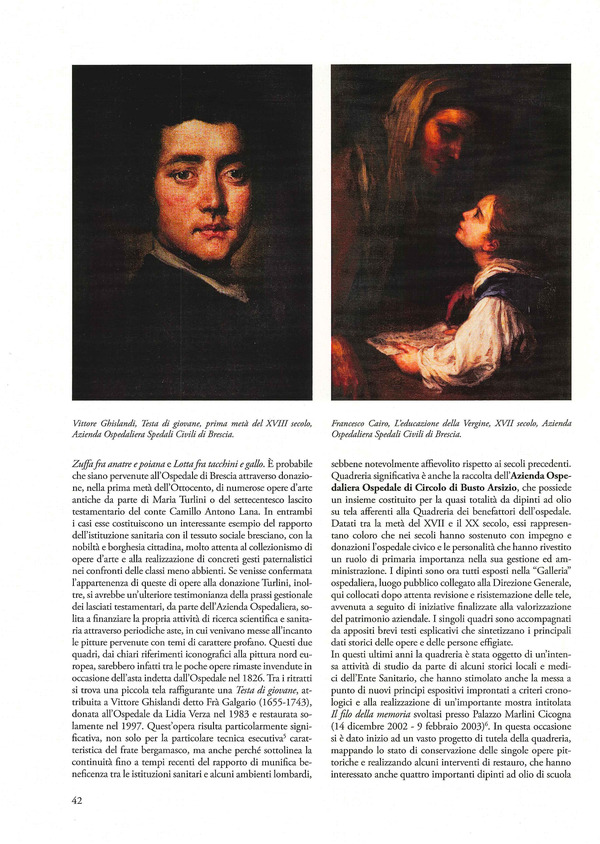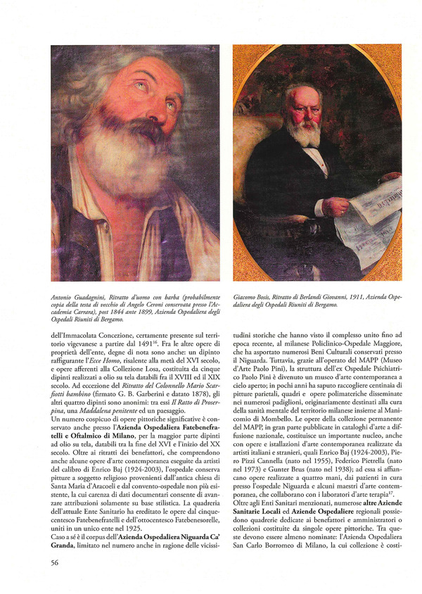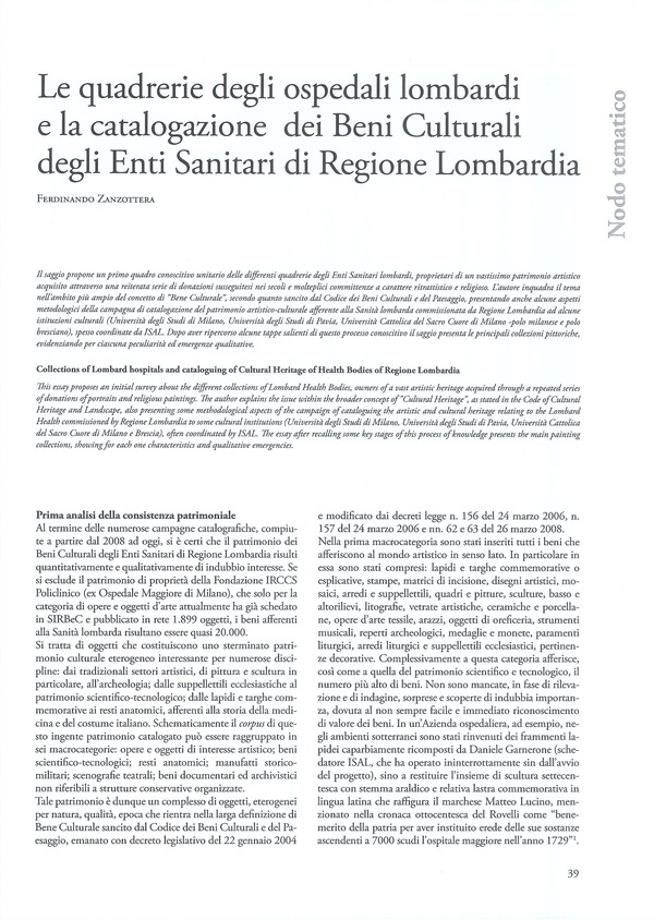 Il saggio propone un primo quadro conoscitivo unitario delle differenti quadrerie degli Enti Sanitari lombardi, proprietari di un vastissimo patrimonio artistico acquisito attraverso una reiterata serie di donazioni susseguitesi nei secoli e molteplici committenze a carattere ritrattistico e religioso. L’autore inquadra il tema nell’ambito più ampio del concetto di “Bene Culturale”, secondo quanto sancito dal Codice dei Beni Culturali e del Paesaggio, presentando anche alcune aspetti metodologici della campagna di catalogazione del patrimonio artistico-culturale afferente alla Sanità lombarda commissionata da Regione Lombardia ad alcune istituzioni culturali (Università degli Studi di Milano, Università degli Studi di Pavia, Università Cattolica del Sacro Cuore di Milano -polo milanese e polo bresciano), spesso coordinate da ISAL. Dopo aver ripercorso alcune tappe salienti di questo processo conoscitivo il saggio presenta le principali collezioni pittoriche, evidenziando per ciascuna peculiarità ed emergenze qualitative.