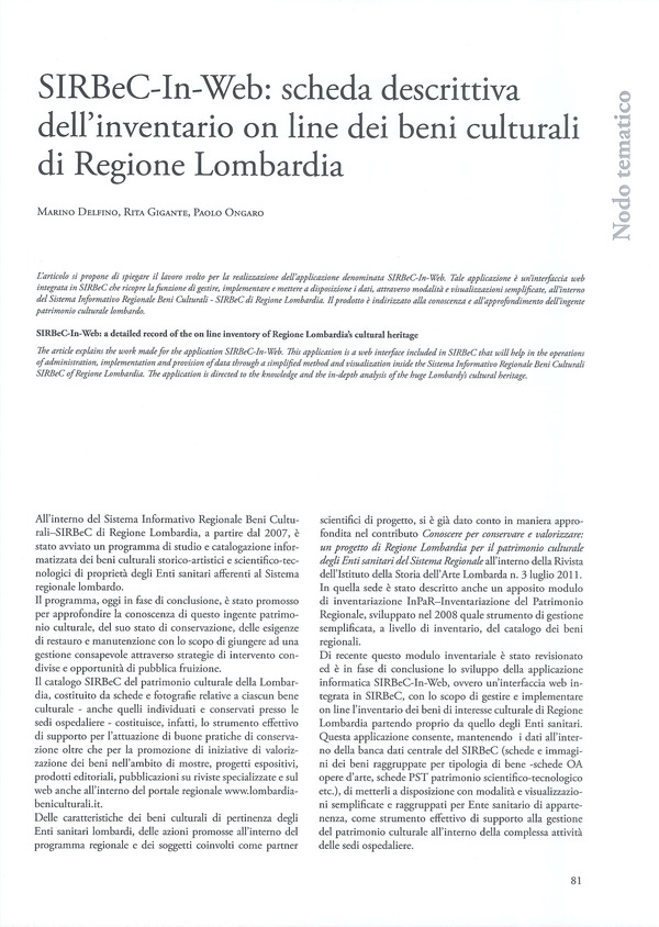 L’articolo si propone di spiegare il lavoro svolto per la realizzazione dell’applicazione denominata SIRBeC-In-Web. Tale applicazione è un’interfaccia web integrata in SIRBeC che ricopre la funzione di gestire, implementare e mettere a disposizione i dati, attraverso modalità e visualizzazioni semplificate, all’interno del Sistema Informativo Regionale Beni Culturali - SIRBeC di Regione Lombardia. Il prodotto è indirizzato alla conoscenza e all’approfondimento dell’ingente patrimonio culturale lombardo.