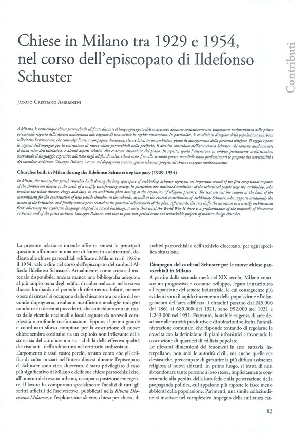 A Milano, le venticinque chiese parrocchiali edificate durante il lungo episcopato dell’arcivescovo Schuster costituiscono una importante testimonianza della prima eccezionale risposta della diocesi ambrosiana alle esigenze di una società in rapido mutamento. In particolare, le condizioni disagiate della popolazione inurbata sollecitano l’arcivescovo, che coinvolge l’intera compagine diocesana, clero e laici, in un ambizioso piano di allargamento della presenza religiosa. Il saggio espone le ragioni dell’impegno per la costruzione di nuove chiese parrocchiali nella periferia, il decisivo contributo dell’arcivescovo Schuster, che sostiene assiduamente il buon esito dell’iniziativa, e alcuni aspetti relativi alla concreta attuazione del piano. In seguito, sposta l’attenzione in ambito prettamente architettonico: osservando il linguaggio espressivo adottato negli edifici di culto, rileva come fino alla seconda guerra mondiale siano predominanti le proposte dei novecentisti e del sacerdote architetto Giuseppe Polvara, e come nel dopoguerra trovino spazio rilevanti progetti di chiese concepite modernamente.
