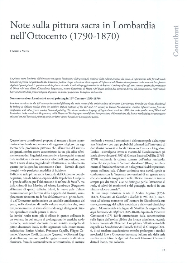 Lombard sacred art in the 19th century has evolved following the main trends of the artistic culture of the time. Late baroque formulas are slowly abandoned by looking at different models, from the northern Italian tradition of the 16th and 17th century to French Neo-classicism. Another influence comes from the comparison with other genres, notably historical painting. The solemn neoclassic language of Appiani lasts until the 1870s, due to the production of Diotti and his students in the Accademia Bergamasca, while Hayez and Piccio propose two different interpretations of Romanticism, the former emphasizing the convergence of sacred art and historical painting while the latter almost heralds the Divisionistic period.